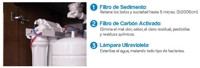El sistema Megachar + UV+ Multimedia filtra y provee agua purificada todo el tiempo.